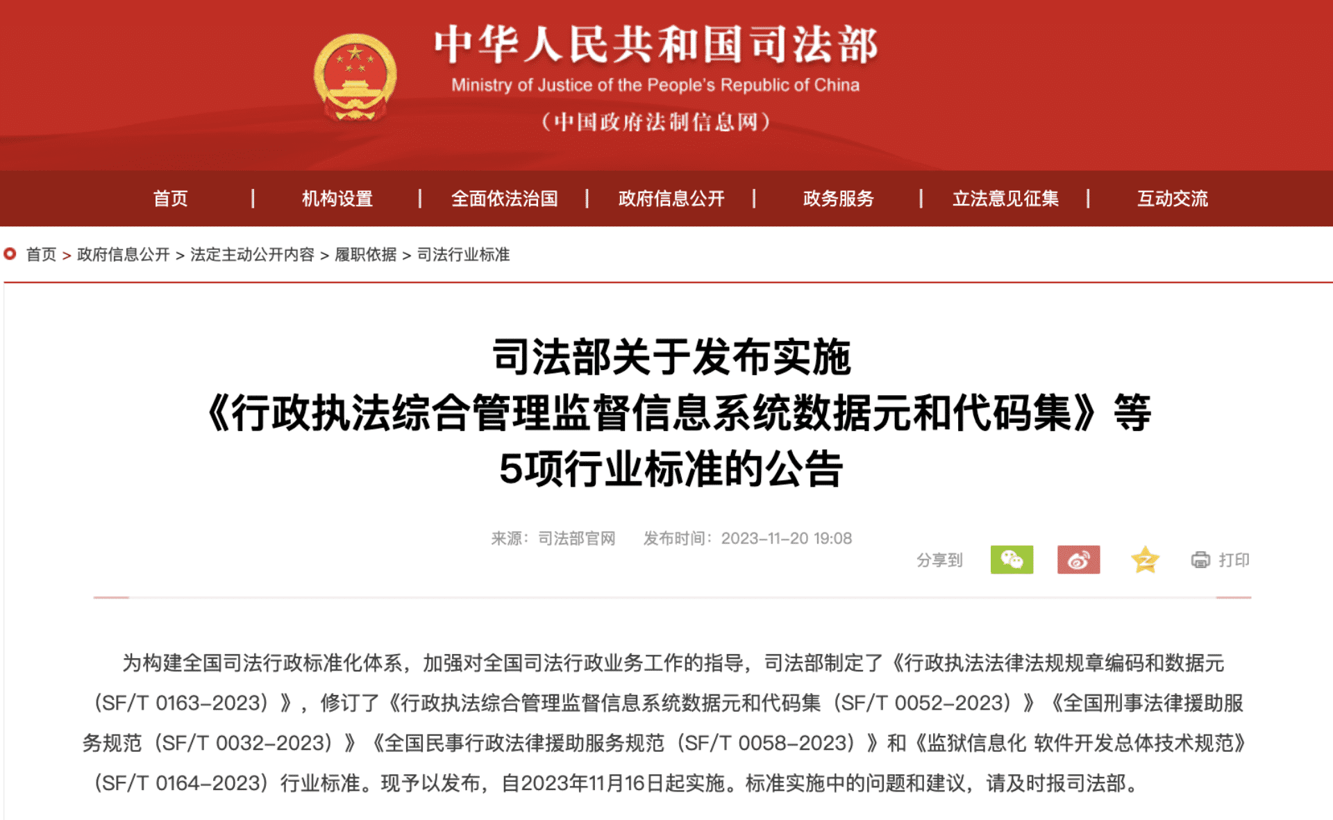 近日,司法部發(fā)布了《行政執(zhí)法法律法規(guī)規(guī)章編碼和數(shù)據(jù)元(SF/T 0163-2023)》行業(yè)標(biāo)準(zhǔn),自2023年11月16日起實(shí)施。...