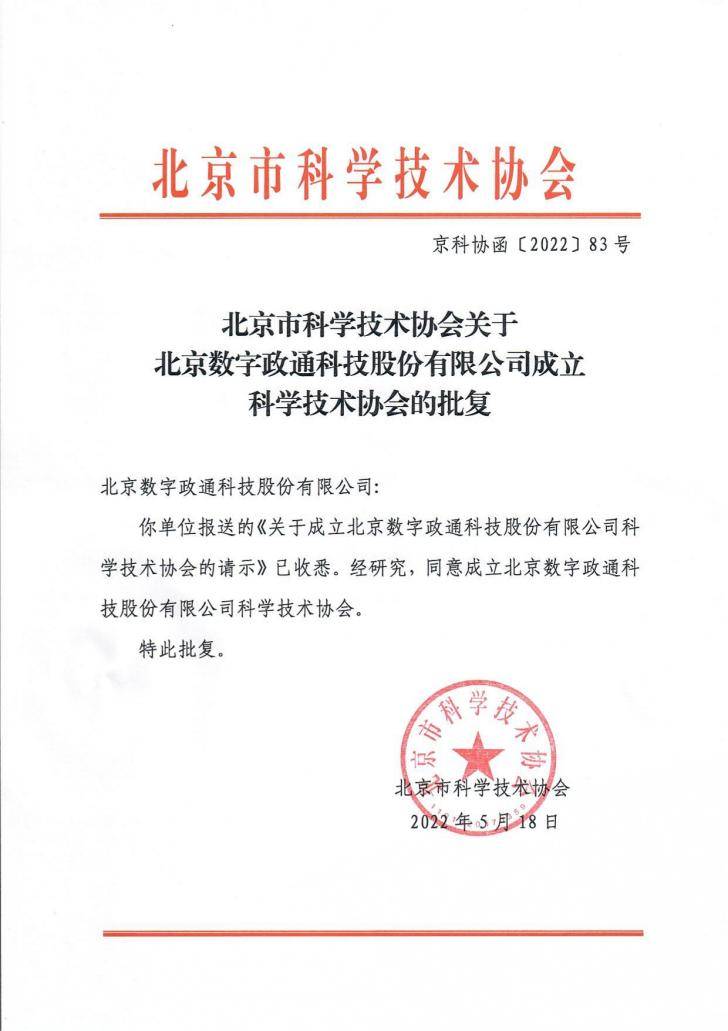 近日,北京市科學(xué)技術(shù)協(xié)會印發(fā)了《關(guān)于北京數(shù)字政通科技股份有限公司成立科學(xué)技術(shù)協(xié)會的批復(fù)》(京科協(xié)函【2022...